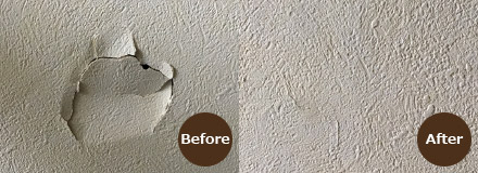壁に物がぶつかってできてしまった穴。いつも気になっていましたがダスキンさんのチラシを見て直していただきました。他の業者さんだと一面貼替になり補修だと半分くらいのお値段でほぼわからない仕上がりに満足しています。
